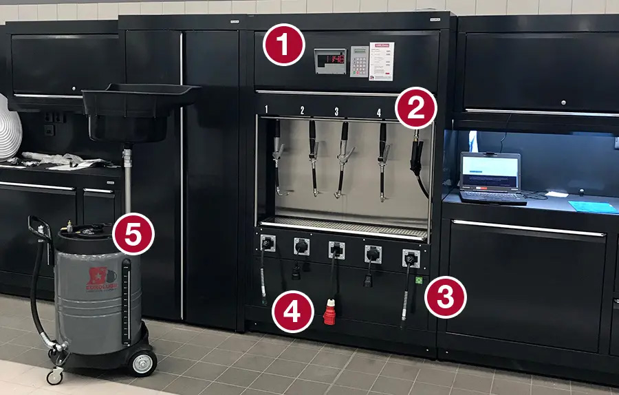 Oliebar med servicevæsker, brugsvand, trykluft samt 230 V. LUBE-Master-system til kontrol og registrering af væskeudtag. Vægmonterede slangeruller med monteringsplade og formonterede burmøtrikker for hurtig montage samt olieventilholder med drypbakke.