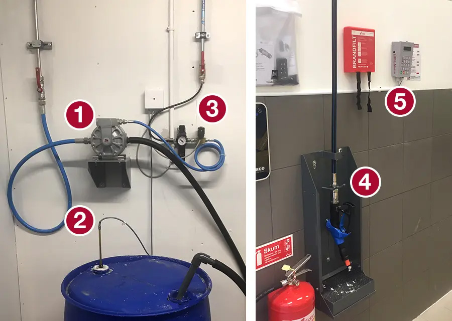 System til pumpning af AdBlue® direkte fra 200 l tønde via rustfri rørføring, videre til slangerulle og afslutningsvis et mundstykke, der er specialtilpasset påfyldning i personbiler. Overvåges af Lube-Master-systemet, så der ikke kan foretages tapninger uden en gyldig arbejdsordre – hver eneste dråbe bliver faktureret.
