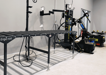 Her er der etableret 3 arbejdsstationer - hver med direkte indkørsel udefra. Ved én af arbejdsstationerne er der gjort klart til at imødekomme fremtidige krav til plads til sporing og kalibrering.Pladeværksted