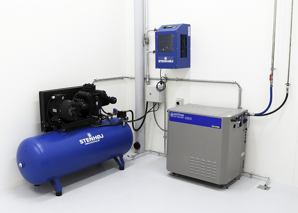 Trykluften leveres naturligvis fra en STENHØJ kompressor der er placeret i teknikrummet sammen med højvakuum anlægget for at minimere støj. Der er etableret trykluft flere steder i huset – på værkstedet leveres trykluften fra luftslangen der er integreret i DEA møblerne, hvor der også er etablere 230 V el-ruller.