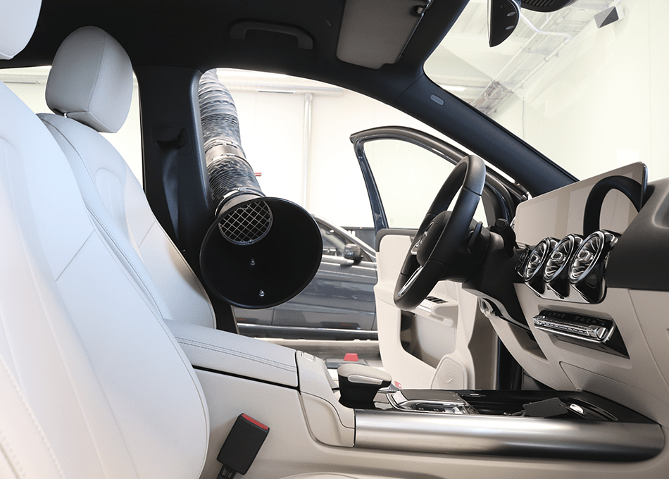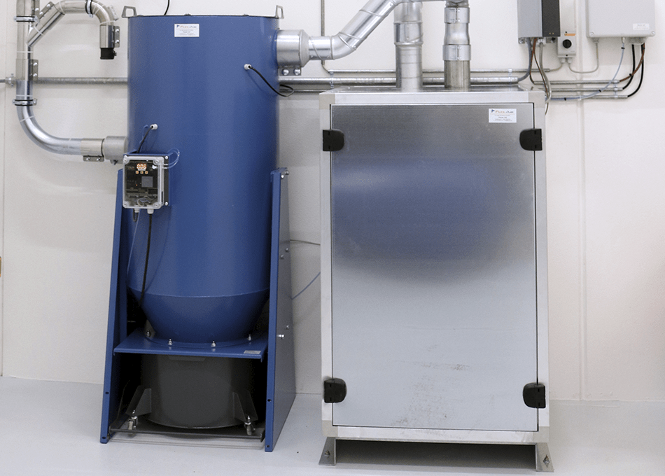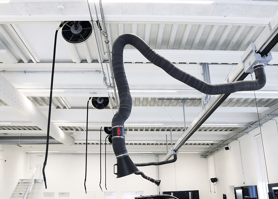 Udsugningen foregår via slædekanaler med udsugningsarme, der giver en fantastisk fleksibilitet på værkstedet. Det er nemt at få udsugningen helt ind i kabinen når der arbejdes med kemi.