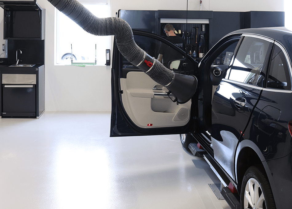 Et højvakuum anlæg til støvsugning er næsten uundværligt på et klargøringsværksted. Udsugningen sker via slangeruller der er placeret nedhængt fra loftet ved hver arbejdsstation.