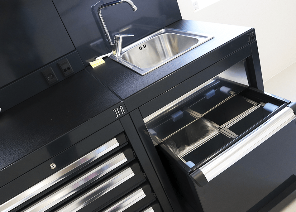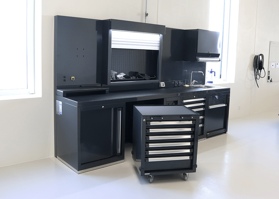 Værkstedet er indrettet med møbler fra italienske DEA, der er kendt for deres høje kvalitet og æstetiske look der spiller perfekt sammen med udtrykket i hele huset. Og så er de praktiske – modulopbygning og den store bredde i sortimentet gør det muligt, at man kan sammensætte hver arbejdsstation præcis som man ønsker. Hos P. Christensen er hver arbejdsstation f.eks. udstyret med håndvask, PC-arbejdsplads, integreret betjening af lift, trykluft og strøm.